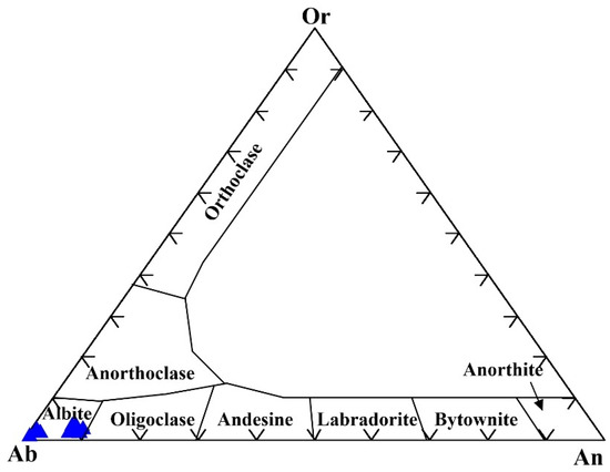 The chemical analyses of major oxides, trace, and rare earth elements of the Abu-Dabbab plagio-granites and their calculated normative mineral compositions are listed in Table 1. The present chemical analyses reveal SiO2 (70.66–74.10 wt.%), TiO2 (0.19–0.28 wt.%), Al2O3 (13.02–14.34 wt.%), K2O (0.01–0.60 wt.%), Na2O (6.57–9.98 wt.%), MgO (0.51–0.61 wt.%), CaO (1.31–1.81 wt.%) and LOI (0.60–1.02 wt.%). Abu-Dabbab plagio-granites are characterized by high SiO2 and Na2O contents. Well-preserved igneous textures and relatively low loss on ignition (LOI) values indicate that the plagio-granite samples have undergone only weak alteration, and therefore the geochemical data largely reflect the primary composition of the rocks. Low K2O content (0.01–0.60 wt.%) is a significant chemical characteristic of Abu-Dabbab plagio-granites. The high Na2O values of the plagio-granites are probably due to plagioclase accumulation (albitization). Many workers suggest that the high Na2O and low K2O contents in plagio-granites are due to exchange with seawater [48]; Ref. [9] or late magmatic vapor-phase transport and removal of K2O [49].