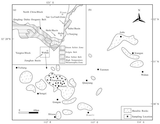 The Jiangling Basin is located in the south of the Dabie Mountain (Figure 1), which represents a Cenozoic rift basin with an area of approximately 28,000 km2. Because of the Qinling-Dabie orogeny and orogenic extensional tectonics that impacted the basin, the region has experienced a developmental history of continental basins filled with thick terrigenous clastic series from the Middle Triassic. Most of the mafic volcanic rocks are buried in the basin with only small exposures at the surface (Figure 1 and Figure 2) [56]. The volcanic activity in the basin can be divided into two cycles: late Mesozoic volcanics and Paleogene volcanics [56].