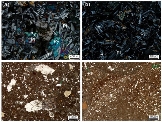 Photomicrographs of volcanic rocks from the Jiangling Basin. Py-pyroxene, Pl-plagioclase. (a) intergranular basalt. Olivine undergoes intense alteration, chloritization, and iddingsitization; perpendicular polarized light. Plagioclase is colorless and transparent and has two groups of complete cleavage; long strip, polarization microscope common twin, interference color level gray, negative low protrusion. (b) Basalt is mainly composed of plagioclase (Pl) and pyroxene (Py), with weak alteration pairs; perpendicular polarized light. Pyroxene is the most common mineral in ultrabasic rocks and mafic rocks. It is greenish black and has two groups of nearly vertical cleavage, often forming irregular stepped fractures. (c) plane polarized light of (a). (d) plane polarized light of (b).