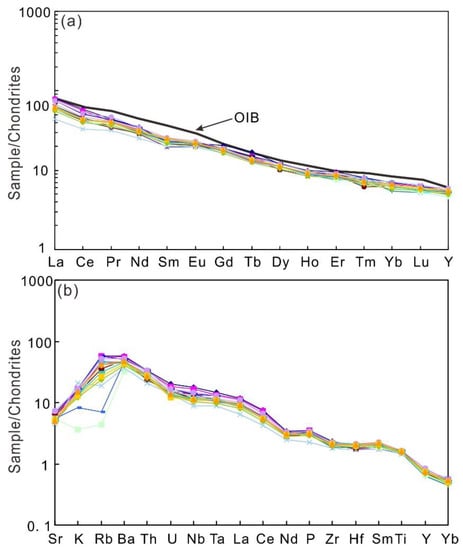 (a) Chondrite-normalized REEs of volcanic rocks from the Jiangling Basin (after [64]). (b) Spider diagram patterns of volcanic rocks from the Jiangling Basin (after [64]). OIB-Oceanic Island Basalt.