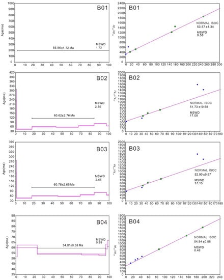 The samples exhibited typical plateau ages without the heat disturbance of an open system. For example, in sample B01, the low-temperature heating step (600–810°C) plateau age of 606 ± 11 Ma rapidly decreased to 54.7 ± 0.35 Ma when heating to 1420°C; the cumulative release of 39Ar during high-temperature heating was 17%. The seven continuous 40Ar/39Ar plateau ages of the heating steps produced a consistent spectrum of ages, and the cumulative amount of 39Ar was 79.71%. The plateau age of the sample was 55.96 ± 1.72 Ma, which is similar to the isochron age within error (53.57 ± 1.34 Ma) (with a higher MSWD of 9.58). The initial value of 294.4 40Ar/39Ar was similar to the pressure value of 295.5, indicating that these samples were not influenced by excess argon micro-cracks in gas operations [78]. Therefore, the plateau age is reliable and represents the magma cooling age. All the other samples have the same reliable data. Because the samples were not affected by deformation and metamorphism, we interpret the obtained plateau ages as emplacement ages, and the age of the Hanjiang River Basin and the Shashi group is as early as the Tertiary volcanic rocks with similar K-Ar ages [36,56].
