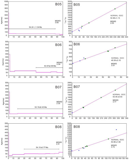 40Ar/39Ar age spectra and isochron ages (Sample B05–B08) of the volcanic rocks from the Jiangling Basin.