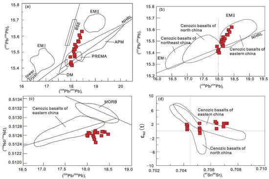 Plots of 207Pb/204Pb(i) vs. 206Pb/204Pb(i) (a,b), 143Nd/144Nd(i)vs. 206Pb/204Pb(i) (c) and εNd(t) vs. 87Sr/86Sr ratios (d) of the volcanic rocks from the Jiangling Basin. Cenozoic basalts of Eastern China from [49,50]; Cenozoic basalts of Northern China from [28,36]; Cenozoic basalts of Northeast China from [36]; EMI and EMII and DMM from [79].