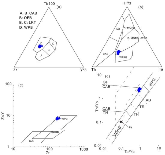 Tectonic environment discrimination diagrams for volcanic rocks from Jiangling Basin. (a) Diagram of Ti/1000 vs. Zr vs. Y × 3 (after [81]); (b)diagram of Hf/3 vs. Th vs. Ta (after [80]); (c) diagram of Zr/Y vs. Zr (after [81]); (d) diagram of Th/Yb vs. Ta/Yb (after [80]). MORB/OIB mid-ocean ridge basalt/ocean island basalt; WPB-intraplate basalts; LKT-low-K arc tholeiite; CAB-calc-alkaline basalt; SH-mugearite; TH-tholeiite; TR-transition basalt; IAB/IAT-island-arc tholeiites; and PM-primitive mantle.