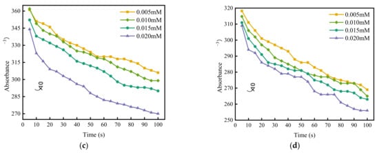 According to the spectrophotometric method, make a tangent to the initial point of each curve in Figure 2. The maximum tangent slope is taken as the fast coagulation rate constant Kf, and the remaining tangent slopes are taken as the slow coagulation rate constant Ks. The ratio of Kf to Ks is the value of the stability factor W under different coagulant concentrations, and then logW is plotted with logC of coagulant concentrations, as shown in Figure 2. The intersection of the fitting line and the abscissa is the logarithm of the CCC values, which are −0.17, −0.2, −1.31, and −1.21, respectively, i.e., 0.68 mM, 0.63 mM, 0.05 mM, and 0.06 mM.