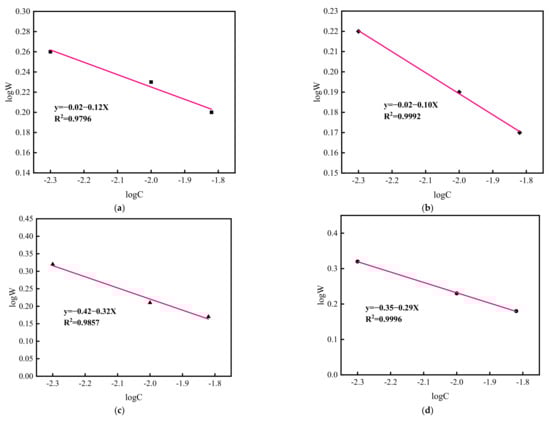 LogW–logC curve of different coagulants. (a) MgCl2, (b) CaCl2, (c) AlCl3, (d) FeCl3.
