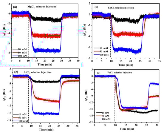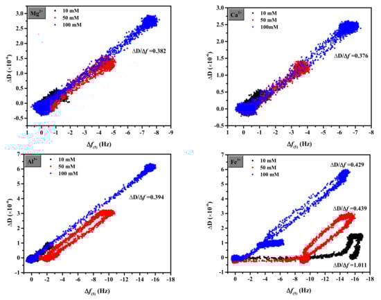 A homogeneous viscoelastic film with shear viscosity, shear modulus, thickness, and density can be used to describe the adsorbed layer. The ΔD/Δf ratio is used to determine the adsorbed layer. Figure 5 shows plots of ΔD against Δf for the sixth overtone. For Mg2+ and Ca2+, the frequency shifts were less than 5 Hz, showing that this layer has a high degree of elasticity and can be considered hard. At different concentrations, the layers generated by Mg2+, Ca2+, and Al3+ were comparable, stiffer, and more compact than those formed by Fe3+. A higher ΔD/Δf ratio of Fe3+ corresponds to a relatively non-rigid open structure, which is steeper than other cations and gradually gentler with the increase in concentration [45]. Additionally, a change in the slope of ΔD/Δf for Fe3+ indicated coverage-induced structural changes in the adsorbed layer. A decrease in the slope indicated that the layer became more rigid owing to the increased packing density [37].