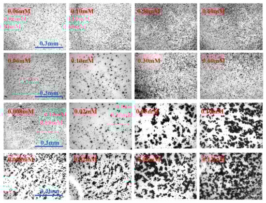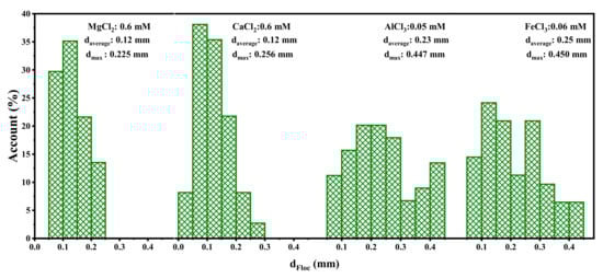 The rate of aggregation is significantly influenced by coagulation mechanisms. The floc size distribution under different coagulant additions nearing CCC is shown in Figure 6. It can be seen that it is difficult to form flocs added with divalent cations. The maximum floc size formed by Mg2+ and Ca2+ was 0.225 mm. For aluminum and iron, the floc diameter can reach ~450 µm at one-tenth the divalent dosage, which is twice that of magnesium and calcium. As shown in Figure 7, trivalent ion coagulants have a larger size range of larger flocs, with the most common floc sizes (more than 60%) being 0.05 mm–0.15 mm and 0.1 mm–0.3 mm for divalent and trivalent ions, respectively. However, no aggregation improvement occurred for trivalent ion coagulants at higher dosages due to the strong repulsion between positively charged particles, coinciding with the zeta potential results. The floc images obtained with different coagulant additions are shown in Figure 7. It can be seen that particle aggregation occurs initially due to particle–particle collisions, which leads to small aggregates and later particle–aggregate and then aggregate–aggregate collisions [46]. As a result, flocs formed porous objects with highly irregular and open structures.