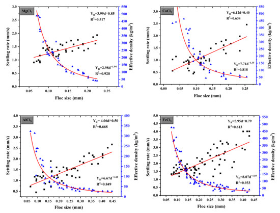 The floc structure properties of sedimentation velocity calculated by PIV and ImageJ and the effective density calculated by the Stokes formula as a function of floc size are shown in Figure 8. The settling rate of flocs formed by the coagulant was slow and generally increased with an increase in floc size, which could be interpreted by a linear function. The effective density decreased with increasing the floc size, which correlated with the Allometric1 model. The sedimentation velocity of Fe3+ was the fastest, and the average velocity and maximum sedimentation rate were 2.14 mm/s and 4.07 mm/s, respectively. The settling velocity of Al3+ was slightly lower than the former with an average velocity of 1.44 mm/s and a maximum velocity of 2.67 mm/s. MgCl2 and CaCl2 generated smaller flocs, and the sedimentation velocity of these flocs was lower. Moreover, it can be seen that the density of main floc diameter affected by Mg2+, Ca2+, Al3+, and Fe3+ ranging from 0.1–0.15 mm, 0.1–0.15 mm, 0.1–0.2 mm, and 0.2–0.3 mm was 250–145 kg/m3, 210–80 kg/m3, 200–60 kg/m3, and 100–50 kg/m3, respectively, the magnitude order of effective density was Mg2+ < Ca2+/Al3+ < Fe3+. Therefore, small flocs formed by electrostatic interactions have a higher effective density but are limited in their growth. Particle destabilization can be considered as an adsorption process for trivalent metals with in situ-hydrolyzed species with a reduced positive charge. Precipitates emerged on the surface as a result of the transition of in situ-produced polynuclear species, resulting in precipitate coverage on the charged surface. As the dosage increased, more precipitates formed not only on the particle surface but also in the solution. Particle collisions expanded from particle–particle to particle–precipitate and precipitate–precipitate, resulting in larger flocs at higher dosages. Thus, there was little water in the small flocs, and the porous larger flocs containing more water led to looser and open structures and lower effective density, which is consistent with the results of QCM-D.