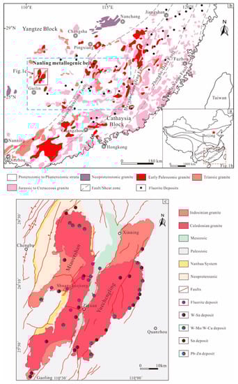 - Fang, G.C.; Wang, D.H.; Chen, Y.C.; Huang, F.; Wang, Y.; Wu, J.X.; Hu, S.F. Metallogenic regularities and genesis of the fluorite deposits in Nanling region. Acta Geol. Sin. 2020, 97, 161–178, (In Chinese with English Abstract). [Google Scholar]