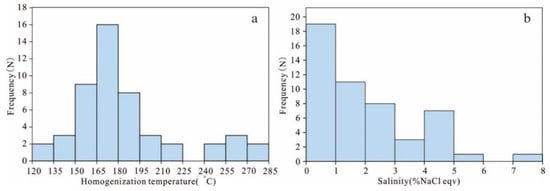 | Sample | Mineral | Type | Counts | Vapor/Liquid (%) | Freezing Point (°C) | Homogenization Temperature (°C) | Salinity (%) |