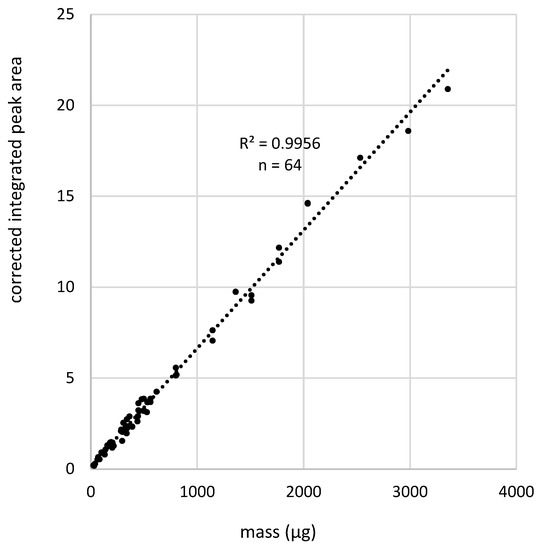 The corrected quartz peak area was then used to estimate mass using a calibration model. For the RCMD samples, the peak area-to-mass calibration was established by NIOSH researchers [43,44,45]. However, since that work was conducted using filters collected in 3-piece cassettes, which have a slightly different dust deposition pattern than 2-piece cassettes, a correction factor derived by Miller et al. [46] was applied. For the dust samples generated from source materials in the laboratory, a calibration model was developed in-house. This is because the lab-generated samples were collected in a small enclosure under high concentration conditions, which can also affect the dust deposition pattern. The in-house calibration curve is shown in Figure 1. It was created by collecting respirable dust samples containing known masses of pure crystalline silica (i.e., Min-U-Sil® 5, obtained from US Silica, Katy, TX, USA) in the same 2-piece cassettes and enclosure as used for the source materials samples.