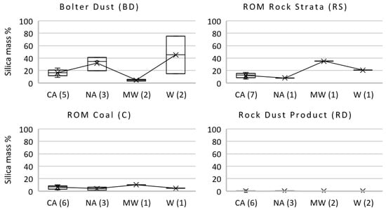 Figure 2 shows the distribution of silica mass% as estimated from the SEM-EDX data for each source material type by mine region. These results strongly suggest that, for the mines represented by this study, the rock strata encountered during coal production and/or drilling for roof bolting operations is the main source of respirable silica. Notably, the RS and BD samples from central Appalachia did not necessarily generate more respirable silica than their counterparts from other regions. Instead, the typically higher silica content in RCMD samples in central Appalachia [20] is likely an artifact of the sheer abundance of rock that is extracted in many mines in this region. For example, Table 1 demonstrates that some mines (i.e., mines 10–15, 21, and 22 at the time of field sampling) were extracting roughly as much rock as coal in terms of total mining height—which means that a substantial portion of the respirable dust coming off the production face is generated from a potentially high-silica source. Indeed, recent work by Jaramillo et al. [48] has suggested that mining into rock strata may generate twice as much respirable dust as mining into the coal seam itself. The above example could be contrasted by that in another mine (e.g., Mine 23) where the rock strata still contain significant silica but there is simply less rock being extracted during mining.