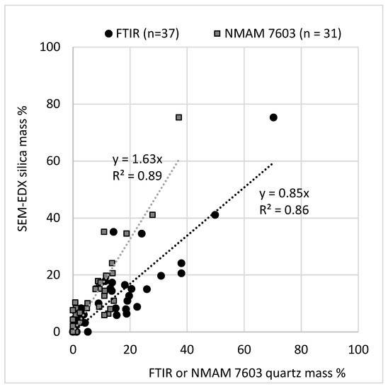Correlation between the silica mass% estimated from SEM-EDX and quartz% measured by FTIR or NMAM 7603 for the pairs of respirable dust samples generated from primary source materials.