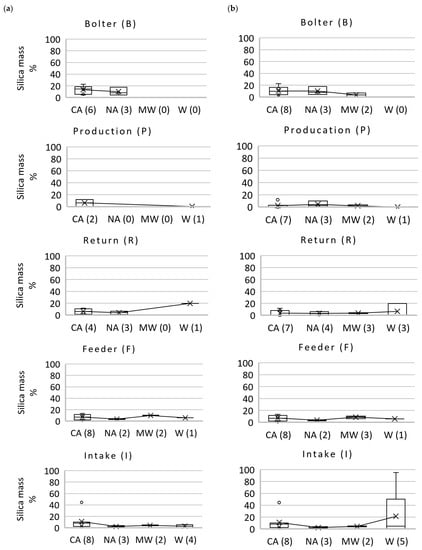 Distribution of silica mass% estimated from SEM-EDX for the RCMD samples, with plots shown by mine region for each sampling location. In (a) high-PLD samples are excluded, in (b) all samples are included regardless of PLD.