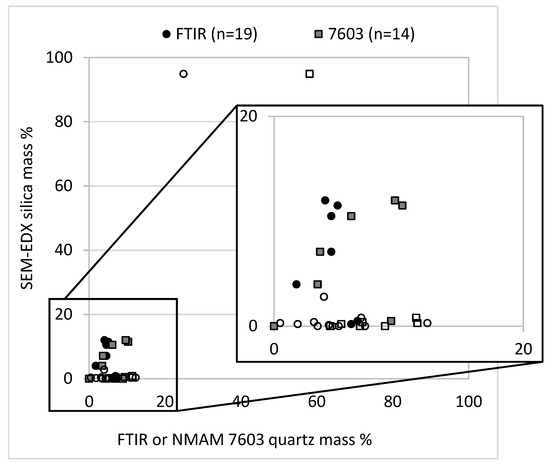 Correlation between the silica mass% estimate from SEM-EDX and quartz% measured by FTIR or NMAM 7603 for the RCMD sample pairs. Filled points indicate an observed PLD < 0.035 particles/µm2; open points indicate a greater PLD. The data cluster in the lower left of the plot is magnified to visualize the effect of PLD on the SEM-EDX estimation of silica%.