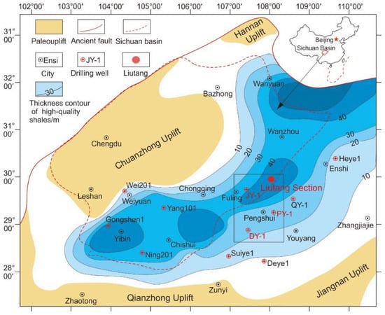 The Liutang section, as one of the most typical profiles for studying the Wufeng and Longmaxi Fms [], is located in Shizhu County, Chongqing Municipality, and is near the Jiaoshiba area which is the largest shale gas field in China. Geologically, Liutang is located in the southern part of the Middle-Upper Yangtze Craton and is adjacent to the southeast Sichuan Basin (Figure 1). The depositions with coarse grains often lead to biased chemostratigraphic results. Thus, in this study, the Upper Longmaxi is ignored due to its high content of arenaceous compositions. The Wufeng Fm. comprises black siliceous and calcareous shales, and contains abundant Brachiopoda and Radiolaria with a thickness of approximately 10 m. The Lower Longmaxi Fm., with a thickness of over 90 m, is mainly characterized by black arenaceous and carbonaceous shales, while on the top of the Lower Longmaxi, arenaceous components are increased dramatically.