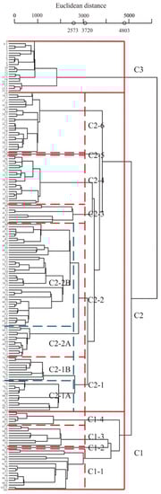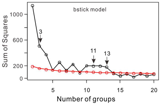 The broken-stick model (abbreviated as the bstick model) proposed by Bennett [] is an efficient way to estimate the statistically significant number of zones in the dendrograms. We used this method to estimate the optimal number of chemozones, which was realized using the bstick.chclust function within the R. As depicted in Figure 2, the numbers 3, 11, and 13 are all statistically significant, and of course, the numbers 2, 4, 6, 8, 10, and 11 are also significant numbers of chemozones. However, too few chemozones (or clusters) may not reveal clear regional patterns [] and also cannot illustrate the high-resolution features of chemostratigraphy. Thus, we firstly selected the Euclidean distance of 4803 in the dendrogram as the cutoff point, then three chemozones were gained (that is, the three first-level chemozones, C1, C2, and C3), and they were thought to represent the regional stratigraphic pattern, and were regarded as first-level chemozones. Then, to better illustrate the geologically local features of the strata, we moved the cutoff values into 3720, then eleven chemozones (C1-1, C1-2, C1-3, C1-4, C2-1, C2-2, C2-3, C2-4, C2-5, C2-6, C3) were gained, as shown in Figure 4, and designated as the second-level chemozones. Notably, the boundaries between these chemozones correlate well to the changing points of the proxy’s profiles (Figure 4). Nevertheless, some local geochemical turning points (Figure 4) on profiles of SiO2/(SiO2 + 5Al2O3), V/Cr, TOC, and Siexc were not wholly unveiled, so we shifted the cutoff value into 2573, then four third-level chemozones were obtained (C2-1A, C2-1B, C2-2A, and C2-2B). The boundary between C2-2A and C2-2B was especially prominent on profiles of proxies (Figure 4). Then, the final number of chemozones was thirteen (Figure 4), which is statistically significant, just as shown in the bstick model (Figure 2). On one hand, this hierarchical method unveiled the regional pattern of the strata, and on the other hand, dug into the local features of the strata.