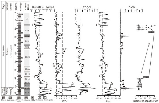 The Chemozone C1 mainly consists of biogenic siliceous and calcareous sequences deposited in deep water. It is characterized by high values of SiO2/(SiO2 + 5Al2O3) (>0.5) and Calcium (Ca) with an abundant occurrence of siliceous Radiolaria and Brachiopod fossils. Simultaneously, the high TOC (>2%) and Siexc (>10) verify high paleoproductivity conditions within C1 chemozone. However, some local differences can also be unveiled by V/Cr and Ca in C1, which subdivide the C1 into C1-1, C1-2, C1-3, and C1-4. C1-1 and C1-3 were featured with dysoxic-anoxic water conditions and high paleoproductivity, indicating deep-water deposition conditions. High SiO2/(SiO2 + 5Al2O3) and Siexc reveal that they are siliceous. By comparison, C1-2 and C1-4 are deposited in comparatively shallow water with lower SiO2/(SiO2 + 5Al2O3), V/Cr, and Siexc values. High calcium levels suggest C1-2 and C1-4 are a set of calcareous deposition.