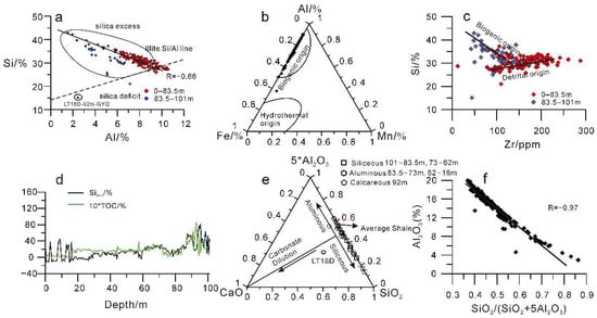 Al2O3, SiO2, and CaO are three of the most abundant components within shale rocks, their proportion decides the rock types and properties. Al2O3 represents terrigenous inputs [,], SiO2 in the strata, as discussed above, is mainly derived from biogenic sources, while CaO is derived from both terrigenous inputs and authigenic oceanic sources [,]. In consideration of the low content of Al2O3 compared with SiO2, and to facilitate the comparison with the average shales, five multiples of Al2O3 were used as one member in the 5Al2O3-CaO-SiO2 ternary diagram (Figure 5e). As shown in Figure 5e, only one sample (sample LT-18D) was plotted on the carbonate dilution line. Thus, the ratio SiO2/(SiO2 + 5Al2O3) can be further used to ensure whether there are aluminous or siliceous depositions for the remaining samples. Generally, Si/Al is the proxy of biogenic quartz [,]. As shown in Figure 5f, a strong negative correlation (−0.97) between Al2O3 (%) and SiO2/(SiO2 + 5Al2O3) emerged, indicating they were mutually diluted between Al2O3 and SiO2. Thus, SiO2/(SiO2 + 5Al2O3) could also be used as a biogenic vs. terrestrial proxy, and the lower ratio indicates more terrigenous inputs and vice versa.