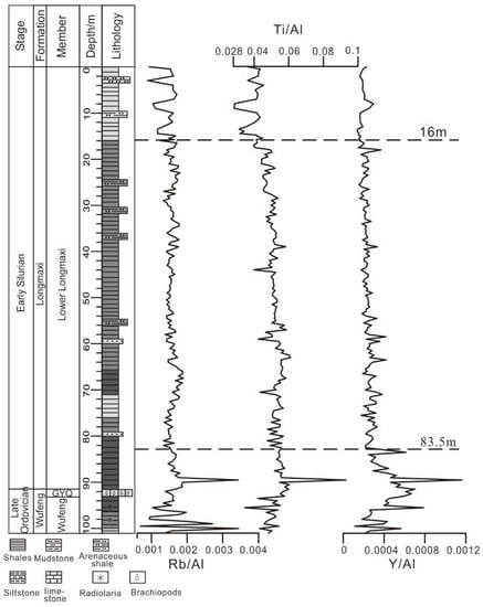 Generally, Rb, Ti, and Y represent terrigenous inputs []. Thus, the profiles of Al-normalized values of these elements could also be used to unveil the terrigenous characteristics of the strata. As shown in Figure 7, the Al-normalized values of Rb, Ti, and Y show similar changing trends. In the interval of 83.5~101 m, the curves of Rb/Al, Ti/Al, and Y/Al show dramatic fluctuation, indicating multiple sources and slow depositional rate in Wufeng and the Bottom Longmaxi Fm. The abundant occurrence of fossils, such as Brachiopods and Radiolaria, within the strata indicate that this fluctuation may be closely related to pulsed biological contribution. In the interval of 83.5~16 m, Rb/Al, Ti/Al, and Y/Al show a slight magnitude of fluctuation indicating that the strata are characterized by a mono provenance and high depositional rate. This characterization is the geochemical response to the fast contemporaneous convergence between ‘Dianqiangui’ and ‘Cathaysia’ and a simultaneously fast global regressive event [,]. The continuous uplifting of the ancient lands and the consistent warming of climate conditions [,] contributed abundant deposition materials to the basin during the deposition of middle Lower Longmaxi Fm. The global regressive event could account for the decline in regional sea levels and increase in the accumulation rate of the strata. Within the interval of 0~16m, Rb/Al, Ti/Al, and Y/Al fluctuate dramatically (Figure 7), indicating that multiple provenance areas contribute deposition materials to the basin simultaneously. Combined with the coeval distribution patterns of land and sea around the basins, the ‘Xuefeng’ paleo-uplift and the ‘Qianzhong’ paleo-uplift were the most possible provenance areas, this is because the Yangtze area in South China was confined by these ancient lands during this period []. In addition, the large-scale tectonic movement which led to the uplift of the Yangtze area [] resulted in an overall regressive event in South China and the formation of a shallow-water deposition condition, under which the accumulation rate became accelerated. The increase in the arenaceous components within this interval also proves the shallowing of deposition water.