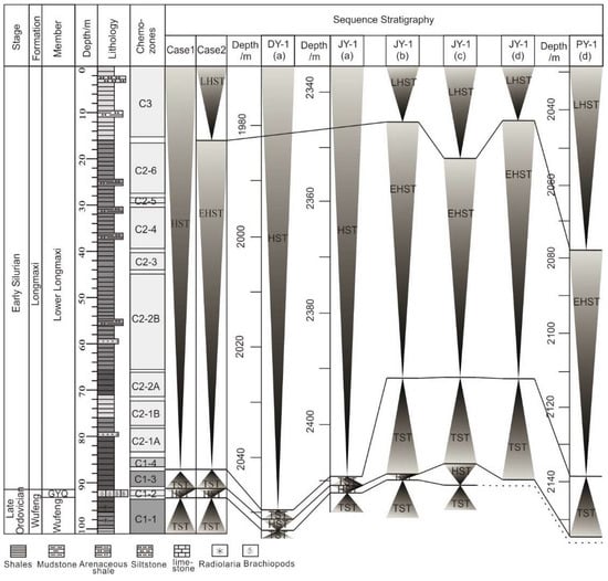 The global eustasy is the main factor controlling the deposition of the Wufeng and Longmaxi Fms., which is also validated by the geochemical proxies and previous research (e.g., [,,]). Thus, the existing stratigraphic framework for the strata is acquired mainly based on the sequence stratigraphy. The wells JY-1, PY-1, and DY-1 (see Figure 1 for their detailed locations), located at the depositional center of Wufeng and Longmaxi, are actually the most-studied wells (e.g., [,,,]), of which the JY-1 well is located at the Jiaoshiba gas field and is the first industrial gas field in China, with recoverable resources of approximately 200 billion cubic meters. Thus, we compared the chemostratigraphic scheme with the sequence schemes derived from these wells. Two kinds of stratigraphic schemes can be obtained from the sequence stratigraphic results for JY-1, PY-1, and DY-1 wells. The first is the results described by Wang et al. [] that the Wufeng and the Lower Longmaxi are comprised of an alternating Transgressive System Tract (TST) and a Highstand System Tract (HST) (Figure 8). The second is described by Chen et al. [], Guo [], and Zhang et al. []: the Wufeng Fm. consists of TST and HST, while the Lower Longmaxi is composed of TST, Early Highstand System Tract (EHST), and Late Highstand System Tract (LHST) (Figure 8). The existing sequence stratigraphic schemes confirm that two major transgressive-regressive cycles have occurred during the Wufeng and Lower Longmaxi periods, which is consistent with our chemostratigraphic finding that the chemozones C1-1 and C1-3 represent two transgressive phases, and the other chemozones (C1-2, and C1-4 to C3) are the depositions during regressive phases.