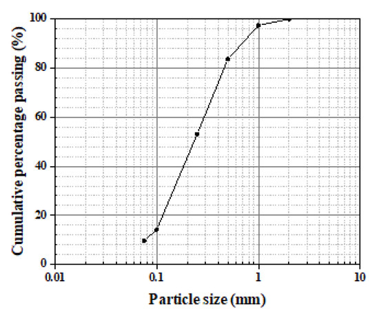 In this paper, a tailings dam located in the seasonally frozen region in Fuxin City, Liaoning Province, China, was used as the study target, and the samples were taken from this tailings dam. The tailings were dried in a drying box, and the natural moisture content was determined to be 11.3%. Tailings sand was screened according to the standard for geotechnical test methods (GB/T 50123-2019) [23]. The fine particles passing through a 2 mm sieve were obtained for testing as the coarse tailings. The dry density of the tailings was 1.79 g/cm3, and the porosity was 0.863. The optimum water content of tailings was measured by compaction testing as 14.8%. The particle size distribution curve is shown in Figure 1. The main compositions of the tailings are listed in Table 1. The water used in this paper was tap water. The main ions in water were Ca2+ (43.7 ppm), Mg2+ (2.35 ppm), and Na+ (3.10 ppm) and the pH value was ca. 7.25.
