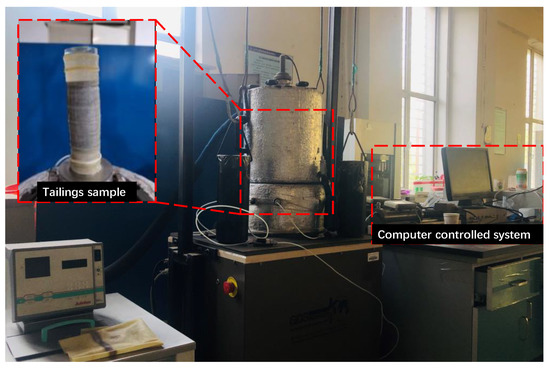 The triaxial test was performed on a permafrost triaxial testing machine. The main technical specifications were as follows: the maximum axial force was 10 kN, minimum measurement value was 0.001 kN, frequency range was 0.001–5 Hz, maximum displacement was 90 mm, minimum measurement value was 0.0001 mm, maximum confining pressure was 1 MPa, and 1.5 MPa back pressure control value. The test machine is shown in Figure 2. After freeze–thaw cycles (10, 20, 30, 40, 50), the shear strengths of tailings samples with different moisture contents (5%, 10%, 15%, 20%) were measured according to the Chinese standard GB/T 17671-1999. The confining pressures were 50 kPa, 100 kPa, 200 kPa, and 300 kPa, respectively, and the shear rate was set to 1%/min.
