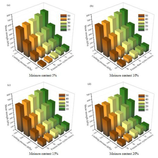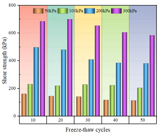 Figure 3 shows a histogram of the average shear strength of the tailings after different times of freeze–thaw cycles. It can be seen that the shear strength of tailings tends to decrease with the increase in the number of freeze–thaw cycles when the moisture content and the confining pressure remain constant, which is consistent with the conclusions of studies on fine-grained soil [25,26]. At a moisture content of 20% and confining pressure of 300 kPa, the shear strength of tailings samples subjected to 50 freeze–thaw cycles decreased by 36.5% compared to that of samples after 10 freeze–thaw cycles. The shear strength of tailings samples showed a slight decay after 20 freeze–thaw cycles, while after 40 freeze–thaw cycles, the shear strength of tailings samples decreases significantly and then remains stable after more freeze–thaw cycles. During the freeze–thaw cycles, the internal moisture continuously undergoes phase transition, leading to continuous expansion and contraction of tailings samples. This may cause damage to the skeletal structure formed by the internal particles. The tailings can resist this phase transition within a certain range; therefore, the shear strength of tailings declines slightly after 20 freeze–thaw cycles. After more freeze–thaw cycles, however, the pore structure of tailings samples reaches the limit of shrinkage and expansion, and irreversible structural collapse occurs, resulting in instability of the overall structure and a significant decrease in shear strength. In addition, after 40 freeze–thaw cycles, the collapsed particles are in a state of irregular accumulation and cannot be restored to their original skeletal structure, and therefore the shear strength becomes stable [27].