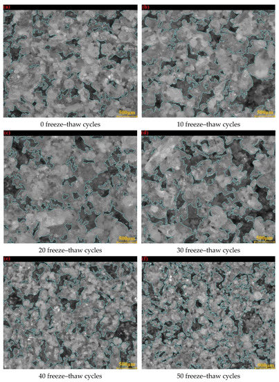 Studies by many scholars have shown that in a freeze–thaw cycle, the tailings structure transforms from an unstable state to a dynamically-stable state gradually, and repeated freeze–thaw cycles will give the tailings a new dynamic and stable equilibrium state [28,29,30,31,32]. In this paper, the tailings sample with 15% moisture content was used as an example to study the microstructure evolution of tailings after different times of freeze–thaw cycles, as shown in Figure 6. In this case, Figure 6a shows the results of the microscopic pore structure of the tailings sample that have not undergone freeze–thaw cycles. It can be seen that the pores are evenly distributed in the tailings, and only small pores are observed. The particles in tailings make contact with each other via point-to-point connections, forming a relatively loose structure with poor bonding quality. With the increase in the number of freeze–thaw cycles, the porosity of the tailings gradually increases. Under the periodic action of freezing and thawing, the water molecules inside the tailings experience water–ice transition cycles. As a result, the internal cracks in the tailings gradually expanded, changing the arrangement of the soil particles. Meanwhile, the porosity increased, which was reflected in the tailings specimens after 10 freeze–thaw cycles. Compared with the unfrozen tailings specimens, the porosity increased by 0.775%, as shown in Figure 6b. Under the action of the first 20 freeze–thaw cycles, the pores and small deformations are generated during the freezing process, but these defects are recovered in the thawing stage [19]. Compared with the unfrozen tailings specimens, the porosity increased by 1.949%, as shown in Figure 6c. After 30 freeze–thaw cycles, the bond between the particles in the tailings is destroyed and large pores are formed. These defects cannot be recovered in the thawing stage. Compared with the unfrozen tailings specimens, the porosity increased by 4.247%, as shown in Figure 6d. However, after 40 freeze–thaw cycles, due to the frequent extrusion between tailings particles, the edges of tailings particles were continuously smoothed and the particles gradually became rounded, which also increases the pores between tailings particles. Compared with the unfrozen tailings specimens, the porosity increased by 5.653%, as shown in Figure 6e. After 50 freeze–thaw cycles, the internal structure of the tailings sample was destroyed, the internal particles became smoother, the pore diameters became larger, and the internal structure became looser. Therefore, the shear strength of the tailings samples was reduced. Compared with the unfrozen tailings specimens, the porosity increased by 6.918%, as shown in Figure 6f. This is a clear indication that the freeze–thaw cycle effect causes changes in the micro-structure of the tailings, and frost heaving stress is the main reason for the sharp drop in the shear strength of tailings.