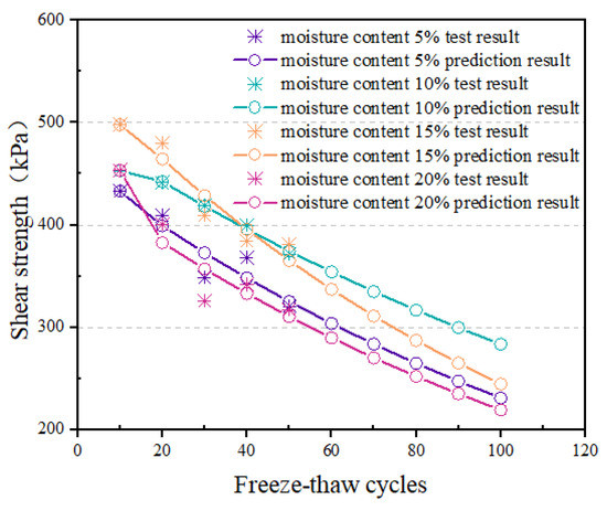 Figure 7 shows the original and predicted values of shear strength of tailings samples after different freeze–thaw cycles. With the increase in the number of freeze–thaw cycles, the shear strength of tailings showed a decreasing trend. In addition, the shear strength decreased more significantly when the tailings sample had higher moisture content. When the moisture content was 10%, the predicted value of the shear strength after 100 freeze–thaw cycles was the largest, 283.31 kPa. However, for tailings samples with 20% moisture content, the predicted shear strength dropped to the smallest value, 219.02 kPa, after 100 freeze–thaw cycles. This is consistent with the results mentioned in the previous section.
