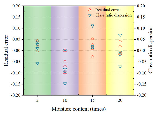 According to Formulas (6) and (7), the residual error and the class ratio dispersion were both less than 0.2, as shown in Figure 8. The relative error of each data set was solved, where the maximum value was 8.87%, indicating a high similarity between the predicted data and the original data. The prediction model can be used to predict the shear strength of tailings samples under freeze–thaw cycles. This model can give the predicted value according to the practical engineering conditions.