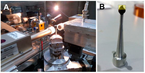 In both experiments, the sample SMC_01 was fixed to the sample holder using albumin (egg white). This substance provides a suitably steady sample fixation while helping to reduce the mounting substrate signal and mitigates the potential for damage to the specimen when it is removed from the sample holder. Then, the fixed sample was placed into the experimental arrangement on a high-precision goniometer and translation stage, which allowed for rotating as well as translating it perpendicularly to the beam (Figure 2A,B). The distance between the sample and both detectors was set at ~27–28 mm, the collimator-detector size was 2 mm, and a 45 µm Al beam filter was used.