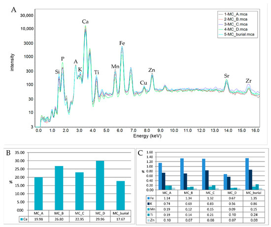 Table 2 and Figure 3A show the range of chemical elements present in the analyzed samples and their relative variation through the Bacabal stratigraphic layers of the site. The calculated amount of Ca (29.96%) is the highest in MC_D (Figure 3B) and the P/Ca ratio values suggest a similar pattern for P (calculated on the Area values in Table 2). At the same time, the MC_D sample shows the lowest amounts of Fe (0.67%), K (0.56%), Mn (0.09%), and Ti (0.10%) (Figure 3C). The inverse distribution is observed for the other samples, where lower levels of Ca (17.67%–26.80%) and P are compensated with higher percentages of Fe (1.14%–1.35%), K (0.69%–0.86%), Mn (0.09%–0.19%), and Ti (0.14%–0.24%). The amount of Zn is quite similar in every sample, but the highest one is in MC_A (0.10%).