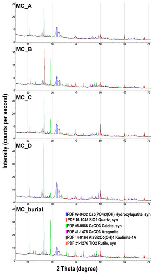 Diffractograms from XRD measures show a noticeable presence of quartz and hydroxyapatite in every sample, particularly in MC_D sediment. By contrast, calcite and aragonite are scarce in this sample as well as in MC_A, where both are practically lacking. The sediment from the burial (MC_burial) shows the highest contents of calcite and rutile, and is the second in terms of quartz and hydroxyapatite contents (Figure 4).