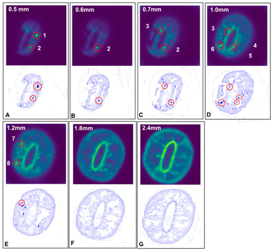 XFCT transmission images from the second XFCT experiment and their correlative X-ray absorption MicroCT reconstructed slices (in blue), both used to track and identify dense bodies. (A) Dense bodies 1 and 2, present in the 0.5 mm XFCT image and the X-ray MicroCT correlative slice; (B) Dense body 2 still visible in the 0.6 mm XFCT image and its correlative X-ray MicroCT slice; (C) Dense bodies 2 and 3 in both images for the 0.7 mm slice; (D) Dense bodies 3 to 6 on both images for the 1.0 mm slice; (E) The dense bodies 7 and 8 on both images for the 1.2 mm slice; (F,G) No dense bodies are present in the slices at 1.8 mm and 2.4 mm.