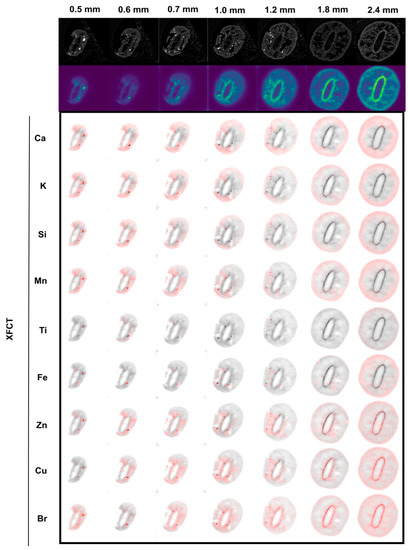 As shown by the XFCT fluorescence images in Figure 8, Ca, K, Si, and Mn cover the outermost portion of the slices but are absent in the endocarp region. These elements are not limited to the border but also extend over a considerable area inside the mesocarp. By contrast, Cu and Br markedly delineate the endocarp layer, being especially visible for the slices near the middle area of the fruit (1.0 mm, 1.8 mm, and 2.4 mm). Only Zn is clearly present in the central cavity delimited by the innermost layer, over the seed/embryo tissues, as shown in the slice 2.4 mm.