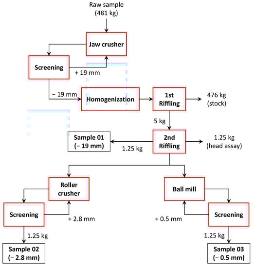 After crushing, the material was homogenized and subsampled using the elongated pile method [22], thus producing a 5 kg subsample. From this, three aliquots of 1.25 kg each, plus one for stocking, were obtained through riffling (Jones Riffle Splitter): (A) −19 mm aliquot; (B) −2.8 mm aliquot, produced by roller crushing (Maqbrit roller crusher); and (C) −0.5 mm aliquot, produced by ceramic ball milling. Milling was conducted over 2 h in a closed circuit with a 0.5 mm aperture screen and having about 35% charge filling. Figure 1 shows a picture of the three aliquots, while the sample preparation scheme is illustrated in Figure 2.