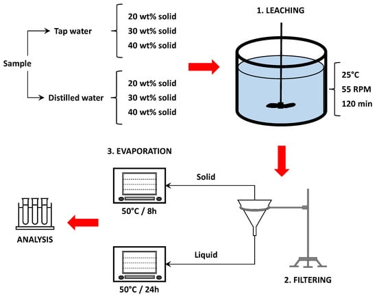 Each of the salt slag aliquots previously described was riffled to produce 70–160 g subaliquots for leaching essays. These were performed using distilled and tap water at 25 °C, pH of 6.9–7.0 (measured by pH meter) and three different solid pulp contents: 20 wt%, 30 wt%, and 40 wt% solid in the pulp. Each leaching system was agitated for 2 h at 55 RPM in a laboratory stirrer. A 1 mL solution sample was extracted every 30 min to determine the evolution of chlorine removal. Leaching tests covered 72 essays with combinations of different operational conditions (solid size, water type, solid content, and leaching time). After leaching, the material was paper-filtered, separating the leachate from the solid. The leachate was then heated in an oven at 85 °C for 24 h to guarantee the total removal of water and crystallization of the leachate. The solid fraction was heated in an oven at 50 °C for 8 h to remove humidity. All leaching tests were carried out in duplicate. Figure 3 shows a schematic of the procedures adopted.