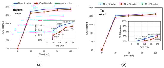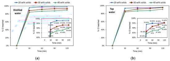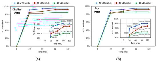 The leaching results for the −2.8 mm slag samples are shown in Figure 5. In all cases, more than 80% of Cl was leached after just 30 min of washing, and no practical constraint occurred for the test with 40 wt% solids in the pulp. Both leaching systems exhibited a similar evolution of Cl removal over time, as can be seen in the inner graphs highlighted in Figure 5. For more diluted systems (30 wt% and 20 wt% solids), a leaching extent higher than 90% was observed for 90 min of washing. At 2 h of testing, the maximum difference between the systems did not exceed 1% Cl leached, thus not justifying the use of distilled water. The solid pulp content had a remarkable impact on the maximum Cl leached, being below 87% for 40 wt% solids and above 92% for the other cases (30 wt% solids and 20 wt% solids).