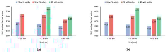 As pointed out by Graziano et al. [14], provided that the efficient removal of salts is achieved, water consumption during leaching should be minimized to reduce evaporation costs. In this respect, Figure 7 presents the ratio between chlorine leached and the volume of consumed water. As can be seen, beyond the direct evidence that more concentrated pulps resulted in higher ratios (meaning less water per % Cl removed), the data show that leaching conducted with larger particle sizes required less water for a given pulp concentration. This reinforces the advantage of leaching salts in not-too-fine particle sizes (−0.5 mm in this case). The one-near exception occurs for 30 wt% solids in pulp, in which the % Cl leached/mL of water values remain approximately constant (0.41–0.44 range) for −19 mm and −2.8 mm sizes. That is, within this range, the use of −2.8 mm slag for washing does not entail significant water consumption compared to larger particle sizes.