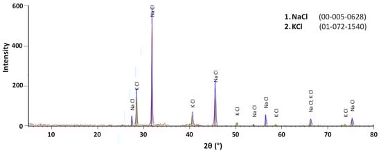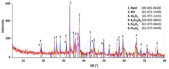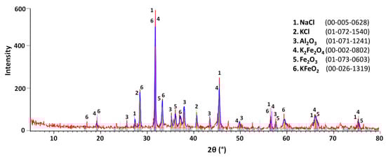 Figure 9, Figure 10 and Figure 11 show the XRD patterns of slag before and after treatment. A semi-quantitative approximation revealed the predominance of NaCl and KCl in the raw slag. Aluminum was identified in the form of Al2O3, corroborating the overlap between Al and O detected in the SEM-EDS analysis. Fe was also detected in three different phases: K2Fe2O4, KFeO2, and Fe2O3. After leaching, the number of salt peaks significantly decreased, consequently intensifying the characteristic peaks of other phases, especially Al2O3 and Fe2O3. The leached sample presented significant overlapping of peaks, high background noise, and low intensity peak characteristics of a high concentration of amorphous phases. This result is compatible with the increase in element dispersion detected by SEM-EDS (see Figure 8). In the crystallized salt, only NaCl and KCl peaks were detectable, confirming the leaching selectivity for NaCl and KCl dissolution.