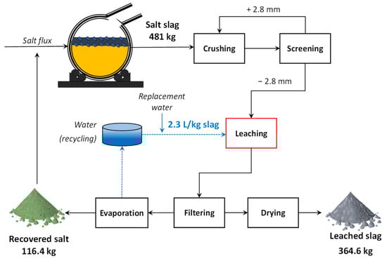 Because of its toxicity and landfilling issues, salt slags require further treatment. As metallic aluminum shows plastic behavior compared to salts and oxides, the standard process for salt slag recycling starts with crushing and screening to remove coarse metallic aluminum, which is fed back to the melting furnace. Aqueous leaching to dissolve the salts (mostly NaCl and KCl) is then applied to the finer fraction, and is typically carried out at 80 °C for 2–3 h [11,13]. The produced brine is then filtered, and water is removed through multi-stage evaporation, resulting in salt crystals (about 70% NaCl and 30% KCl) that can be subsequently recycled as flux [5,11,13,14,15,16]. The remaining low-salt solids can be landfilled, recycled to the primary extraction process for Al recovery [17], or even used as clinker additives for cement production [11]. There is still the possibility of using the produced gases (generated due to reactions with water) for heat generation and energy recovery systems. Hydrogen generation during hydrolysis reactions has been of particular interest, and boosting its production during leaching steps has been the subject of previous works [18]. More detail about the industrial processing of salt slags and management of the output products can be found in Gil and Korili [13].