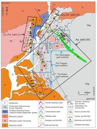 The Cu–Fe ore belt is developed in the skarn contact zone between intermediate-acid magmatic rocks (granite, quartz monzonite, and diorite) and dolomite of the Gaoyuzhuang Formation in the northwestern part of the mining area. The length of the belt controlled by the project is ~1500 m, and the width is 100–300 m. A total of 12 orebodies have been found in this belt, with 70°–90° dips and 60°–75° dip angles. The I-1 orebody is the largest orebody (Figure 3).