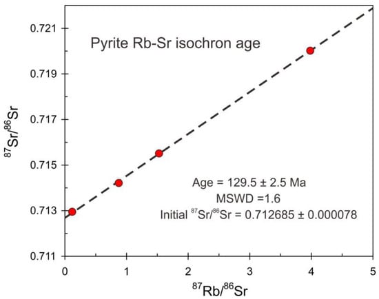 Pyrite is the most important gold-bearing mineral and has a close genetic relationship with gold mineralization. It is an important means of obtaining the age of gold mineralization. Four valid pyrite Rb-Sr isotope dating samples were obtained, and the results are summarized in Table 1. The Rb and Sr concentrations of the pyrite samples range from 0.2952 to 0.8907 ppm and from 0.6592 to 7.586 ppm, respectively. The 87Rb/86Sr ratios range from 0.1176 to 3.981, and the 87Sr/86Sr ratios range from 0.712953 to 0.720021. Four samples are plotted in Figure 5, and a straight line is fitted through the least square method, which defines a robust isochron age of 129.5 ± 2.5 Ma (MSWD = 1.6) with an initial 87Sr/86Sr value of 0.712685 ± 0.000078 (Figure 5). This age can represent the mineralization age.
