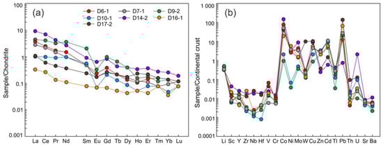 The pyrites in the Miaoan Au-polymetallic deposit have low REE contents (0.36–8.60 ppm) and are enriched in LREEs relative to HREEs (LREE/HREE ratios of 4.86–18.64 and LaN/YbN ratios of 7.77–35.38; Table 2). The REE distribution pattern of pyrite is weakly right-inclined (Figure 6), which should be due to the high Cl- or F- ions in the ore-forming fluid [78,79]. The Hf/Sm, Th/La, and Nb/La ratios were generally less than 1 in Cl-rich hydrothermal fluids and were generally greater than 1 in F-rich hydrothermal fluids. The HFSEs are commonly enriched in F-rich hydrothermal fluids [80]. The trace elements in the pyrites of the Miaoan Au-polymetallic deposit were depleted in HFSE and relatively enriched in chalcophile elements, such as Co, Cu, Zn, and Pb, and large ion lithophile elements, such as Li, Sc, Y, and Nb (Figure 6). This suggests that the ore-forming fluid has Cl-rich features. The ratios of Th/La and Nb/La were less than 1, which is also in good agreement with the Cl-rich feature for the ore-forming fluid. This is similar to those of the Jiaojia gold deposit in the Jiaodong Peninsula [56].