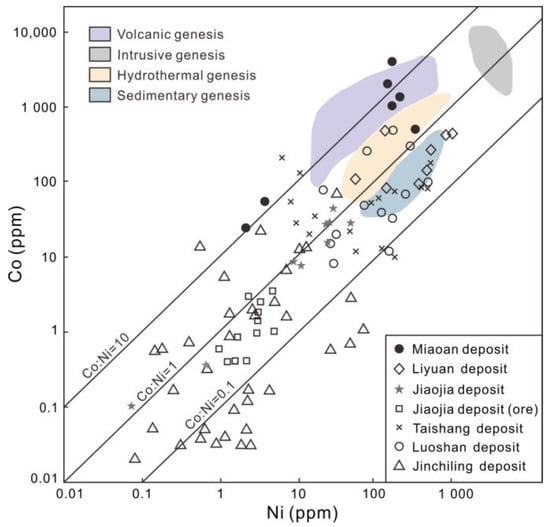Co and Ni may replace Fe2+ in pyrite by isomorphism. Therefore, the Co/Ni ratio is significant in terms of the formation of pyrite [61]. The results show that the Co/Ni ratio of sedimentary pyrite is typically less than 1, averaging 0.63. The average Co/Ni ratio of hydrothermal pyrite is approximately 1.7, and the individual values are generally less than 5. The Co/Ni ratio of pyrite related to magmatic origin is generally greater than 5 and typically from 5 to 50 [81]. In the Miaoan Au-polymetallic deposit, the Co/Ni ratios of pyrite range from 1.50 to 23.39, with an average value of 10.92, which is consistent with those of magmatic origin. In Figure 7, the pyrite of the Miaoan Au-polymetallic deposit plots in the magmatic, hydrothermal, and lower left range, all of which are located near the line of Co/Ni = 10, with a relatively concentrated distribution. The Co and Ni contents and the Co/Ni ratios are similar to those of the Liyuan gold deposit in the center of the NCC but higher than those of the gold deposits in the Jiaodong area. Compared with that of the Jiaodong gold deposits [56], the distribution of the pyrite Co/Ni ratios of the Miaoan Au-polymetallic deposit was relatively concentrated (Figure 7), indicating that pyrite is likely related to volcanism and hydrothermal fluids.
