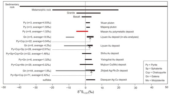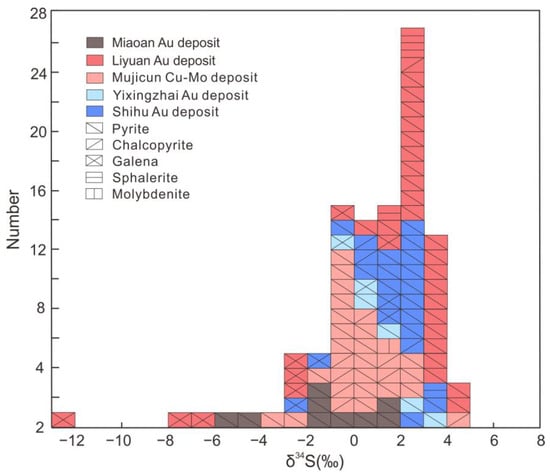 Figure 8. Histogram of S isotope data for gold and nonferrous metal deposits in the northern Taihang Mountain. The data of this histogram are sourced from this study and the literature (the Miaoan Au-polymetallic deposit (this study), the Mujicun Cu deposit [64,65,66], the Shihu gold deposit [13,62,63], the Yixingzhai gold deposit [24], and the Liyuan gold deposit [67]).