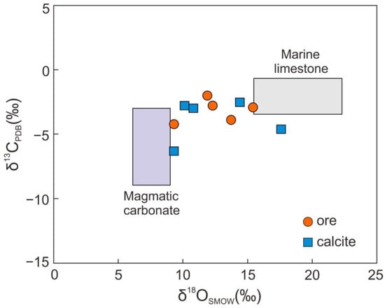 The results of the C–O isotopic compositions of hydrothermal calcites and ores in the Miaoan Au-polymetallic deposit are shown in Table 4 and plotted in Figure 9. The δ13CV-PDB values of the calcite and ore samples ranged from −4.2‰ to −2.0‰ and −6.3‰ to −2.5‰, respectively. Relative to the V-PDB standard, the δ18OV-PDB values of calcite and ore varied from −21.0‰ to −15.0‰ and −20.1‰ to −12.9‰, respectively. For the V-SMOW, the δ18OV-SMOW values of calcite and ore varied from 9.3‰ to 15.4‰ and 9.3‰ to 17.6‰, respectively. The results show that ore and calcite have similar C–O isotope compositions. They lie in the field between magmatic rocks and marine carbonates, suggesting multiple sources of ore-forming fluids.