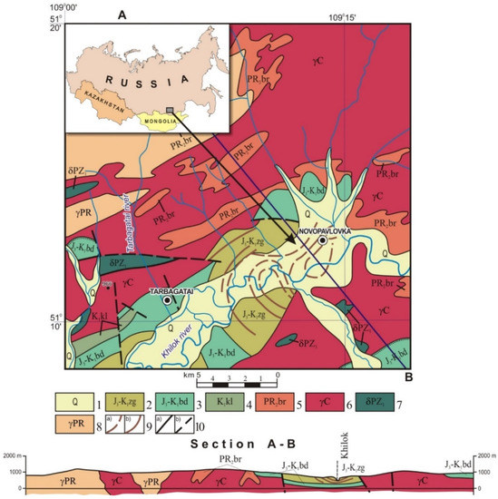The location and geological map of the study area [65]. Note: 1—Quaternary gray-colored sandy rubble deposits; 2—Paleogene–Neogene gray-colored terrigenous (clayey siltstone, occasionally clayey sand) deposits; 3—Lower Cretaceous coal-bearing molasse; 4—Upper Jurassic–Lower Cretaceous basalt, basaltic andesite, and andesite; 5—Upper Jurassic–Lower Cretaceous basalt–trachybasalt, trachyandesite; 6—Middle–Upper Permian rhyodacite, rhyolite; 7—Upper Permian rhyolite, trachyrhyolite; 8—Triassic–Lower Jurassic granite, leucogranite; 9—Tectonic dislocations: (a) found, (b) assumed; 10—The developed area with the coal mine.